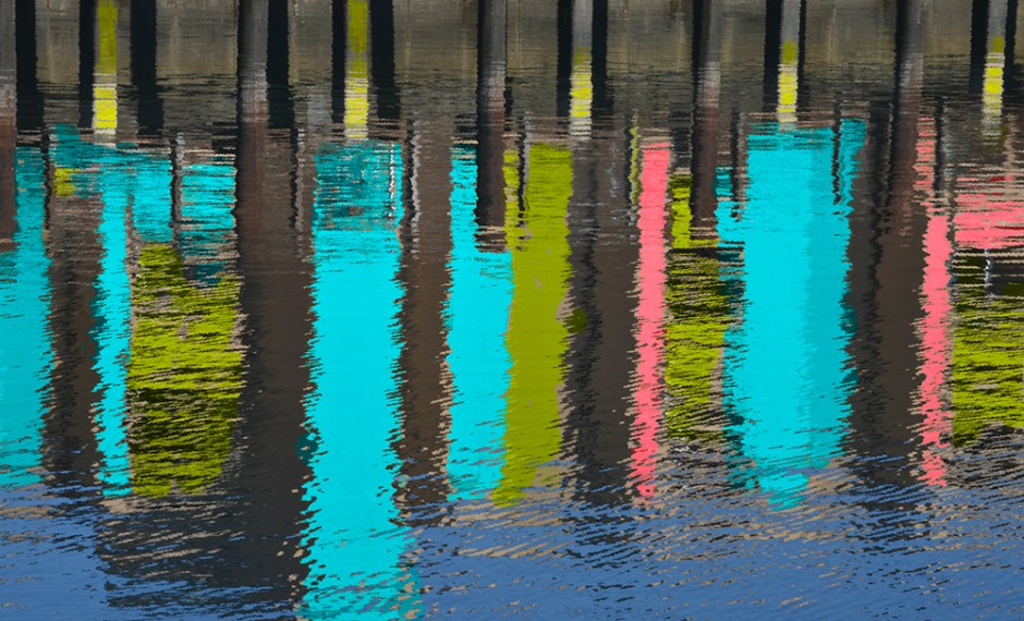 The afternoon sun casts abstract reflections of harbor wharf pilings in Newport Beach, California.