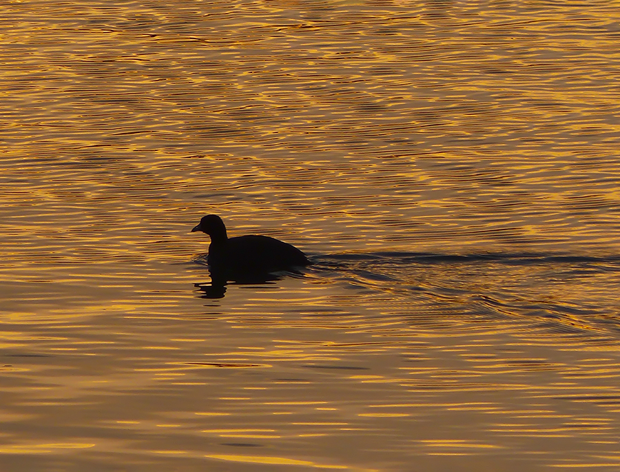 Duck Silhouetted by Reflected Sunset Paddles Across a Lake