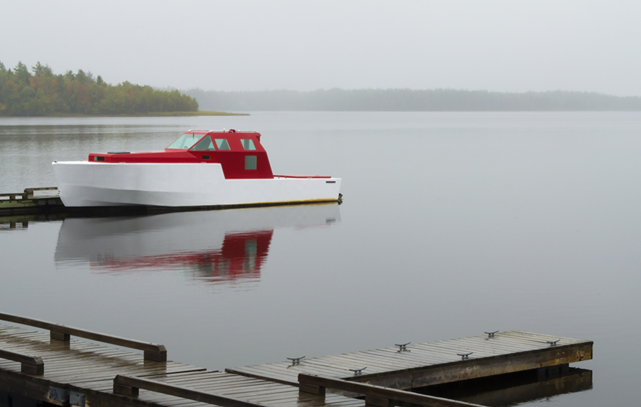 Boat Docked Beside New Brunswick Shore on a Foggy Autumn Day #216