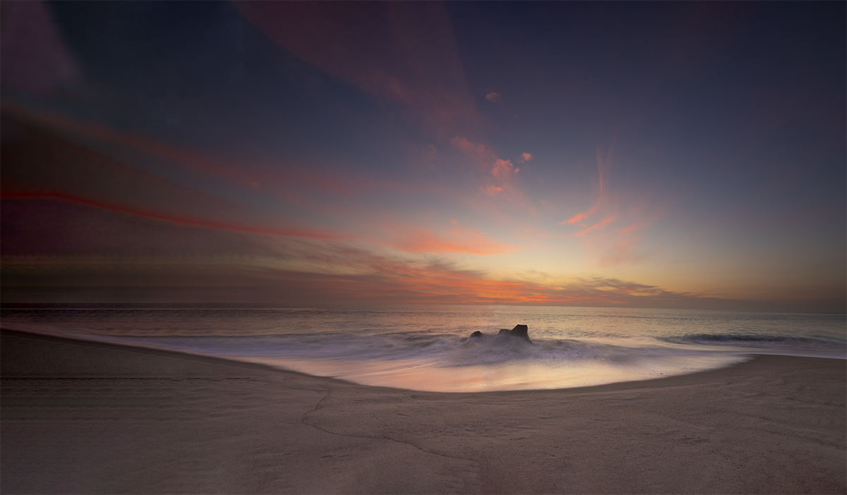 The setting sun gives an otherworldly look to this quiet cove in Laguna Beach, California.