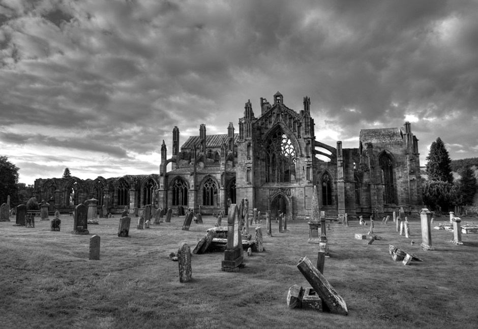 Originally founded in the 12th century, later destroyed and rebuilt in the 14th century, these abbey ruins and grounds are the resting place of a number of Scottish kings. The site, chosen by Cistercian monks in 1136, is located in Melrose, Scotland, near the River Tweed